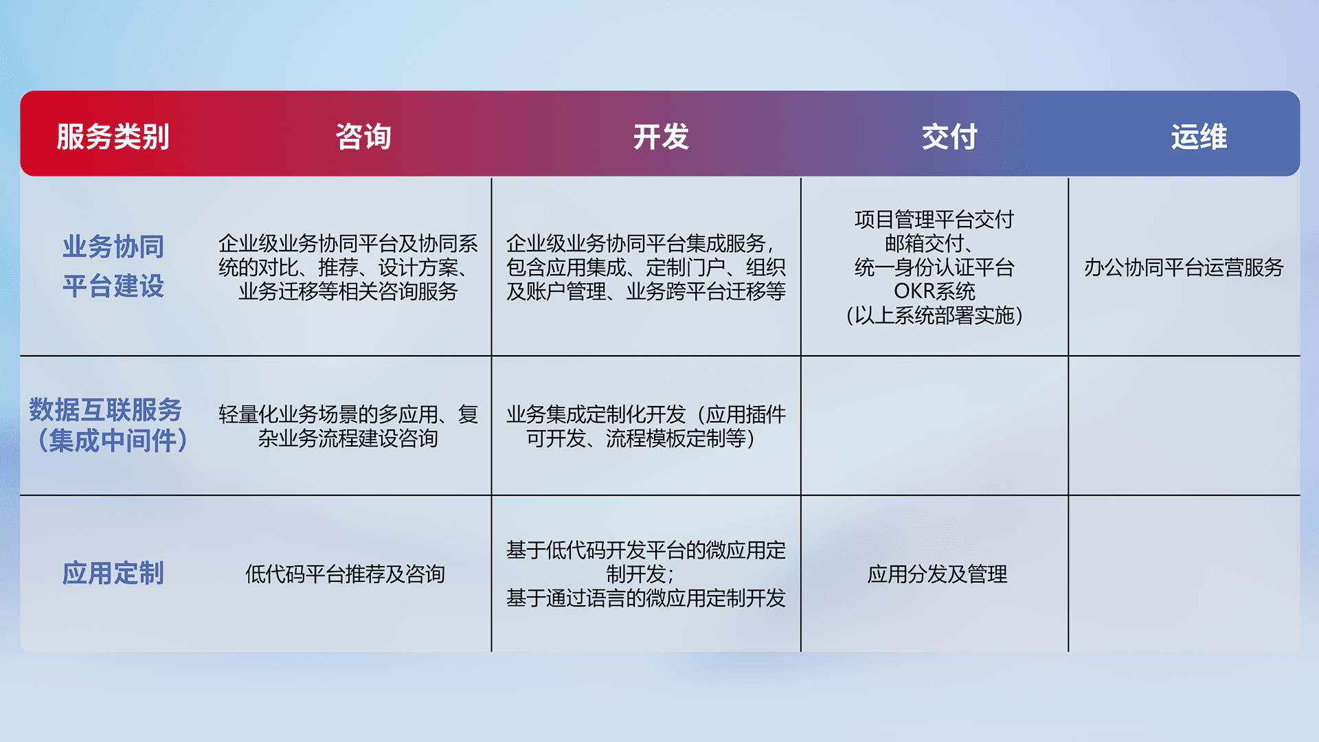 针对钉钉、、、、企微、、IDaas等平台级产品提供产品的规划、、、、方案、、交付、、、定制化开发等服务,,,实现如统一协同办公、、智能客户服务、、混合会议管理、、、、智能数据查询、、、等业务场景,,,实现数字化转型。。。